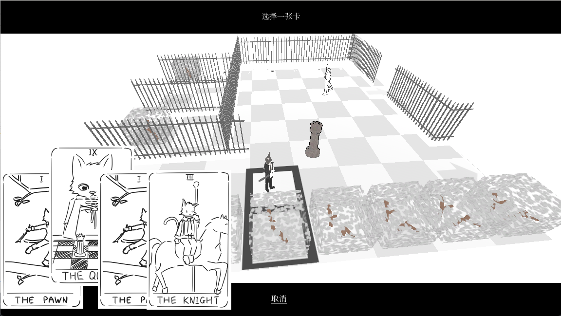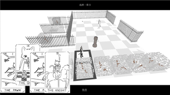 这是一款基于国际象棋改编的冒险游戏。玩家可以在游戏中通过棋盘操作自由探索,找到在散落在棋盘中的棋子,通过使用卡牌的方式放置棋子进行战斗。